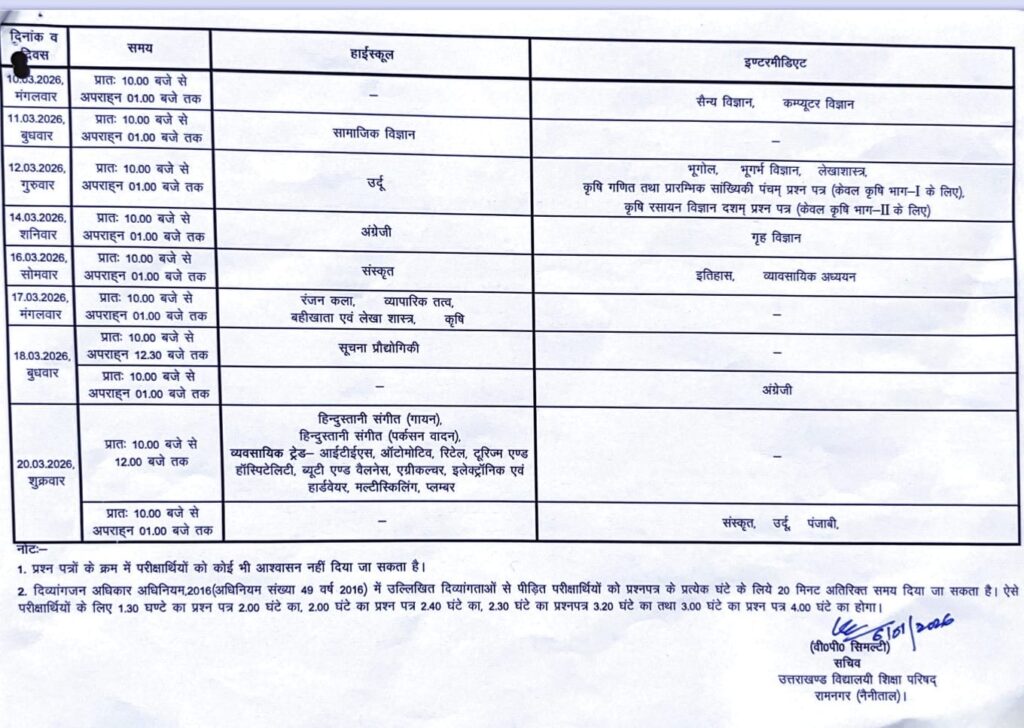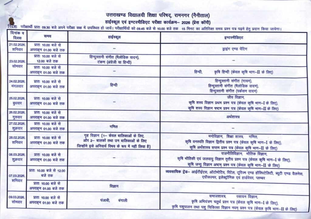 UK Board Datesheet 2026|Class 10th/12th UK Board Datesheet 2026|उत्तराखंड बोर्ड समय सारणी 2026